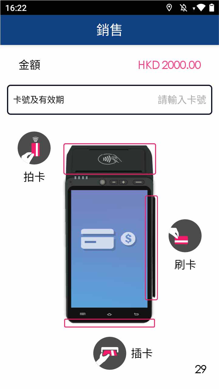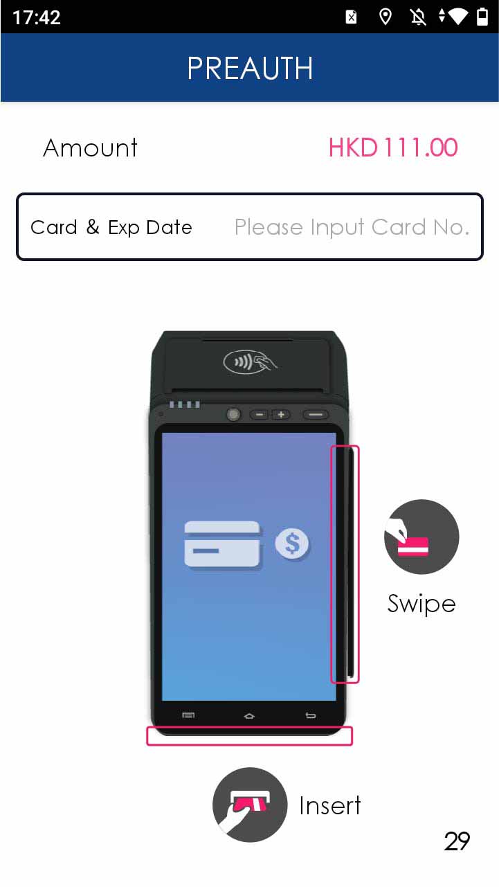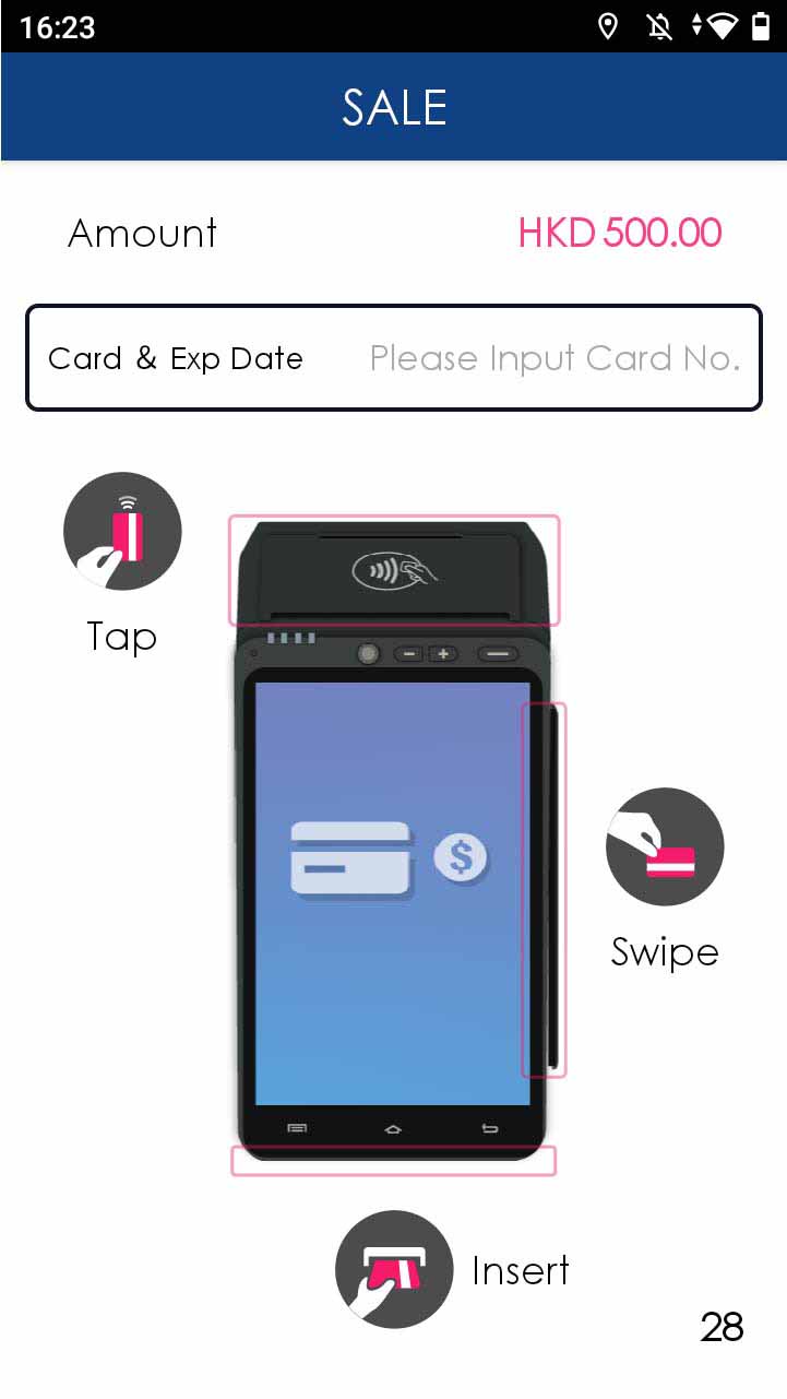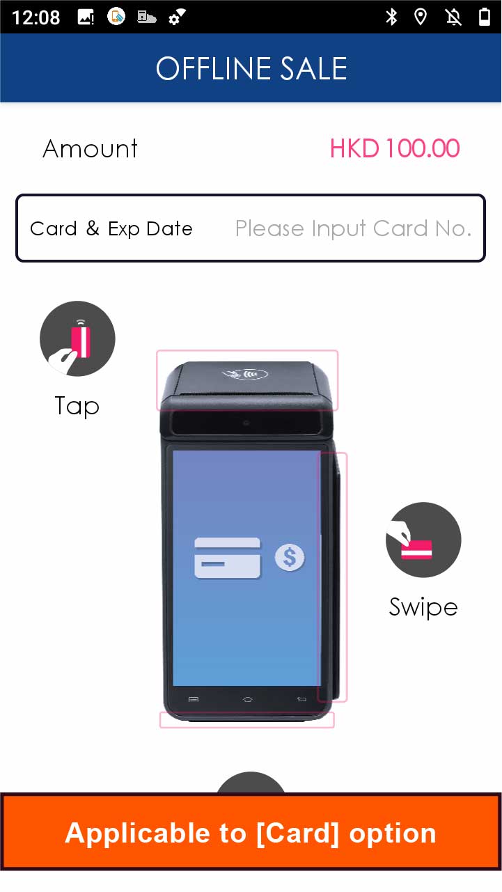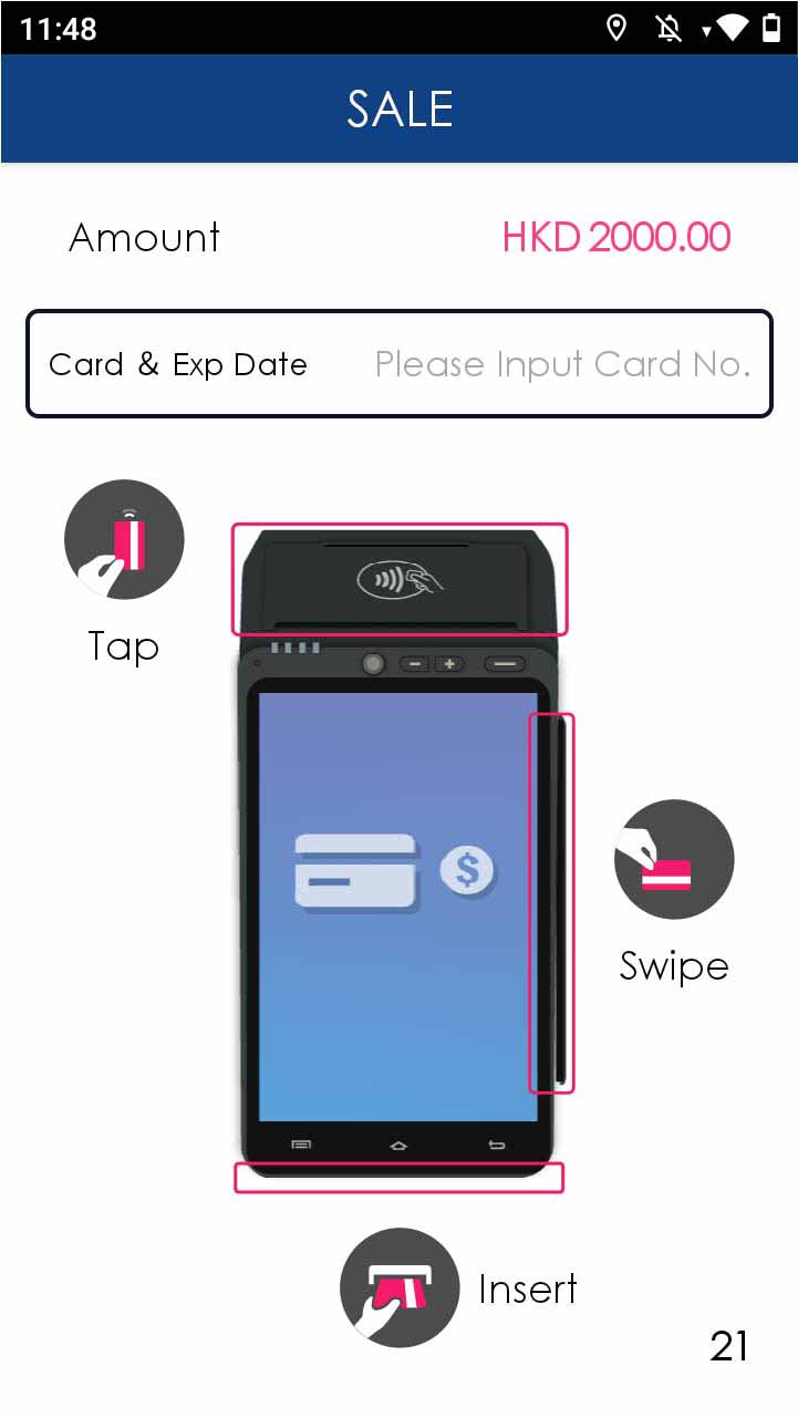Insert/tap/swipe card OR mobile payment OR manually enter card number & expiry date