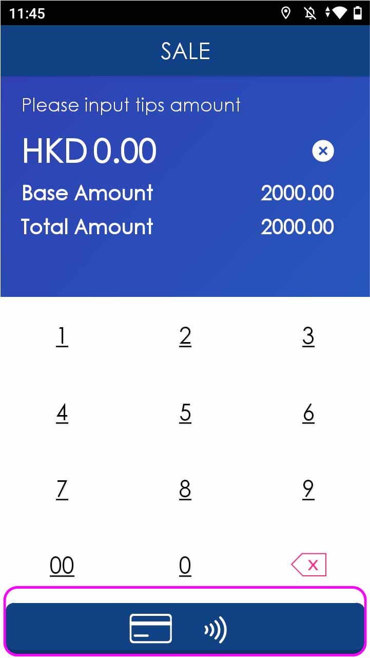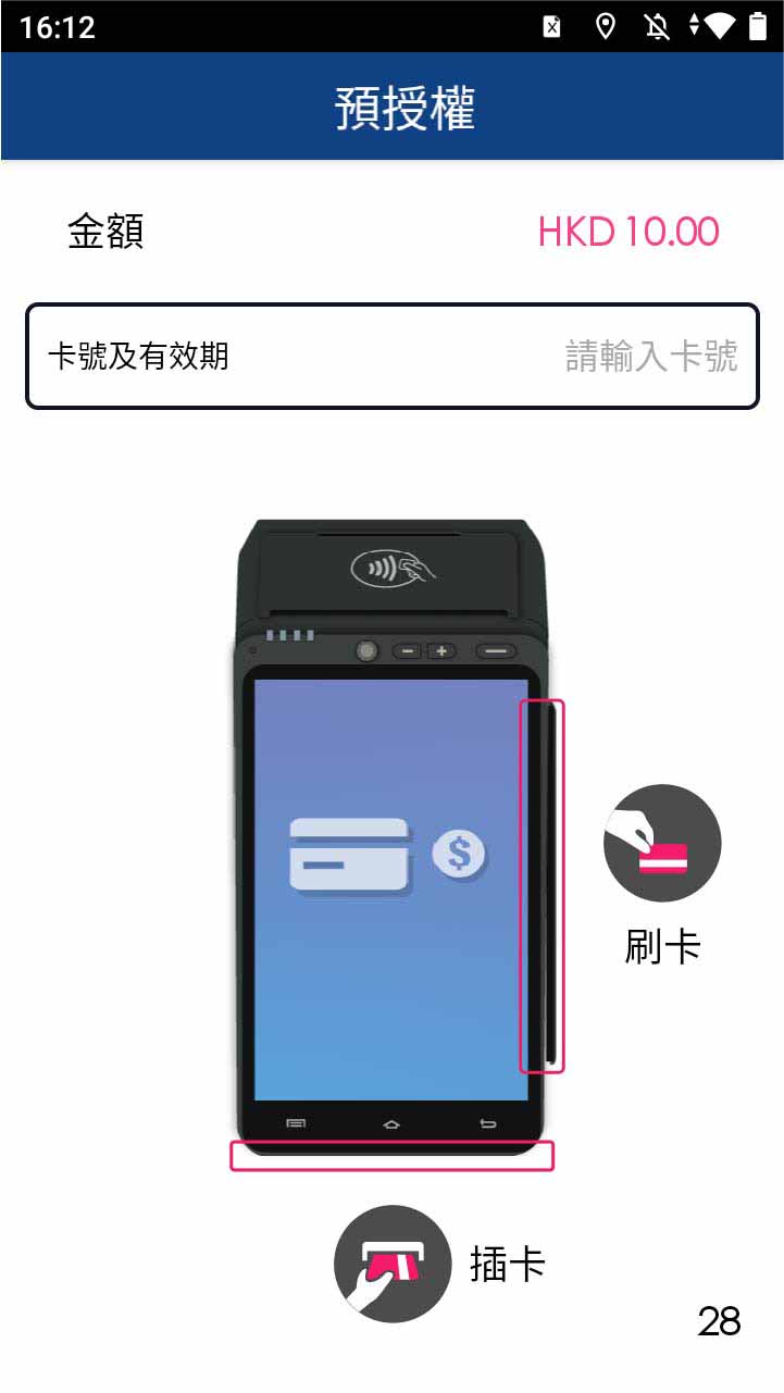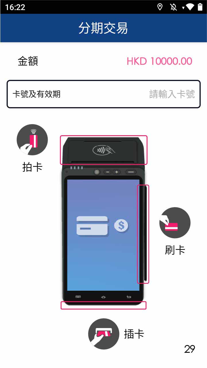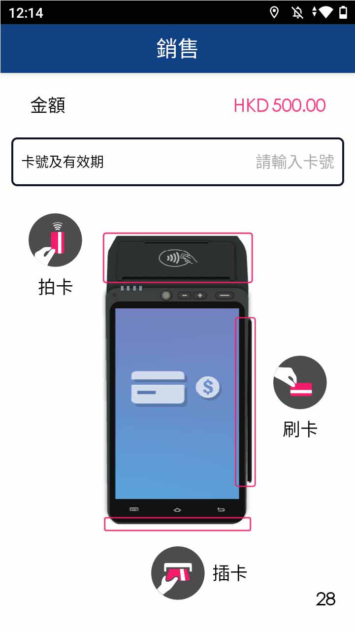 Insert/tap/swipe card OR mobile payment OR manually enter card number & expiry date